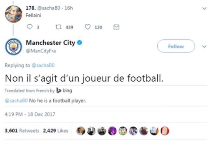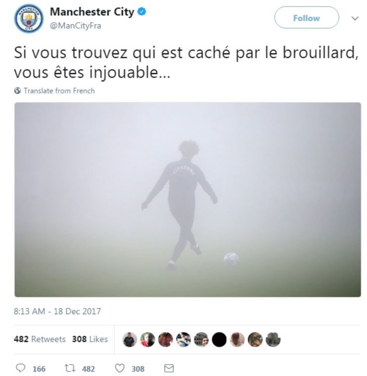 Todo comenzó con una foto y una frase publicada por el perfil oficial del City. "Si encuentras a quien está oculto en la niebla, no puedes jugar", decía. En la foto se podía apreciar, pese a la niebla, a Sané, jugador del City. Se sabe que es él por su característico corte de pelo. Su peinado, por otro lado, es muy parecido al de Fellaini y un usuario contestó eso, que se trataba de Fellaini, jugador del United.