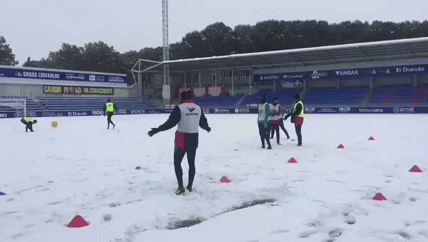 La Sociedad Deportiva Huesca ha entrenado pese al temporal de nieve que se está viviendo en tierras oscenses. Son primeros en la Liga 123 con cinco puntos de ventaja sobre el 2º y seis con el 3º.