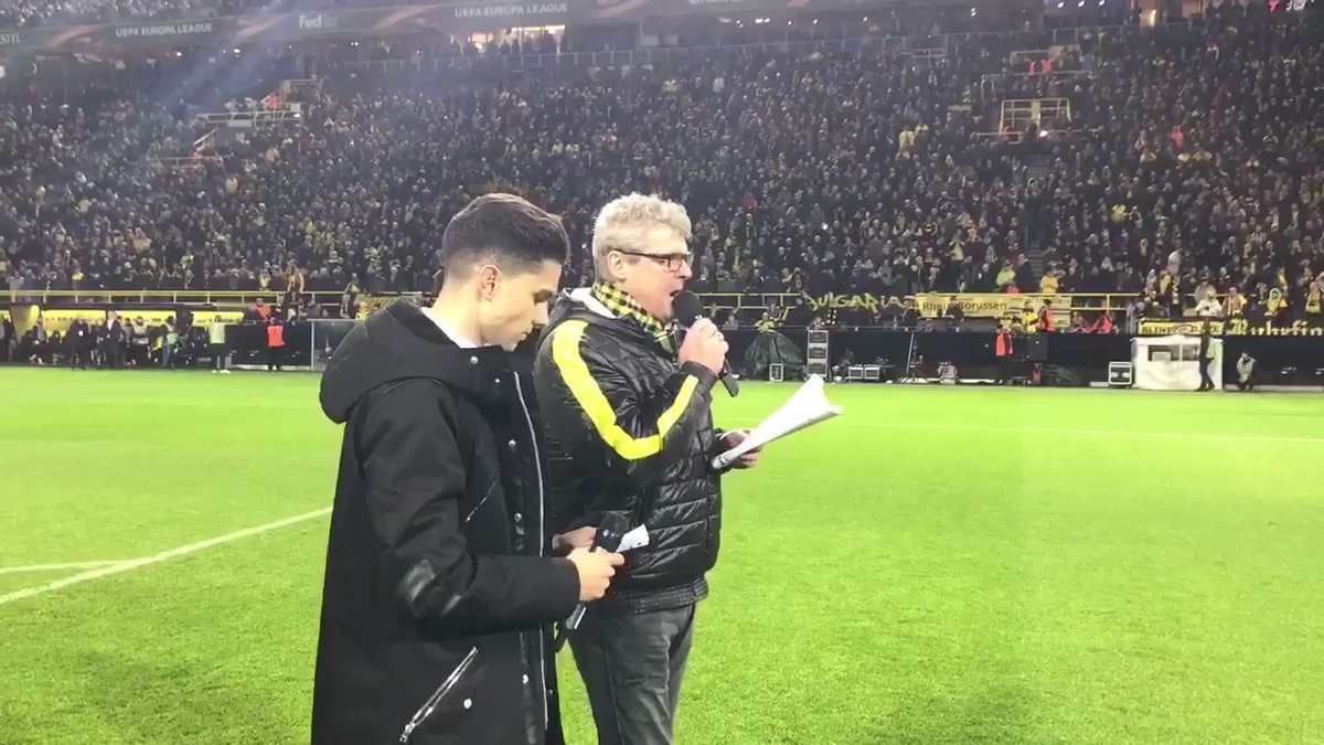 Marc Bartra hizo de 'speaker' en el homenaje que le rindió el Borussia Dortmund