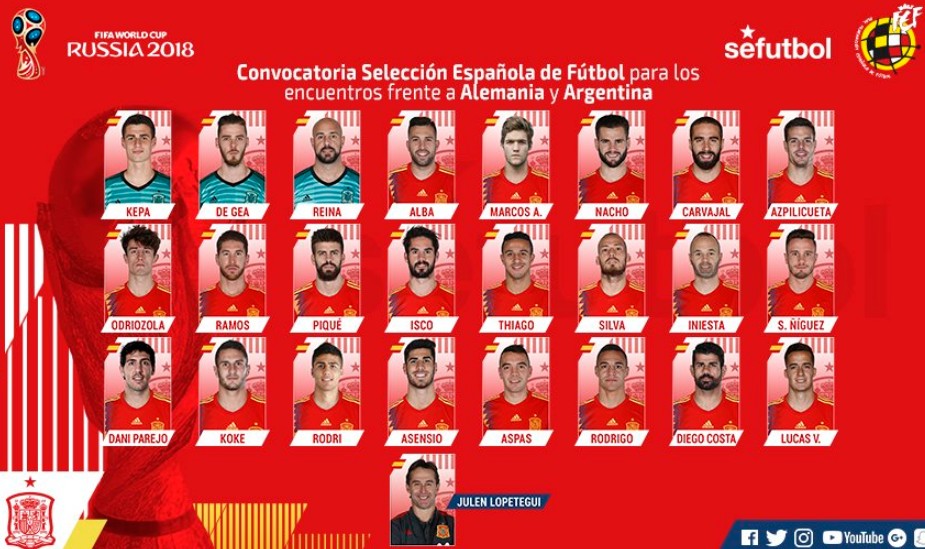 El seleccionador nacional absoluto Julen Lopetegui facilitó este viernes la lista de 24 convocados para los amistosos ante Alemania y Argentina, con las grandes novedades de Marcos Alonso (Chelsea), Rodri Hernández (Villarreal) y Dani Parejo (Valencia), la vuelta de Diego Costa (Atlético) y la ausencia destacada de Álvaro Morata (Chelsea).