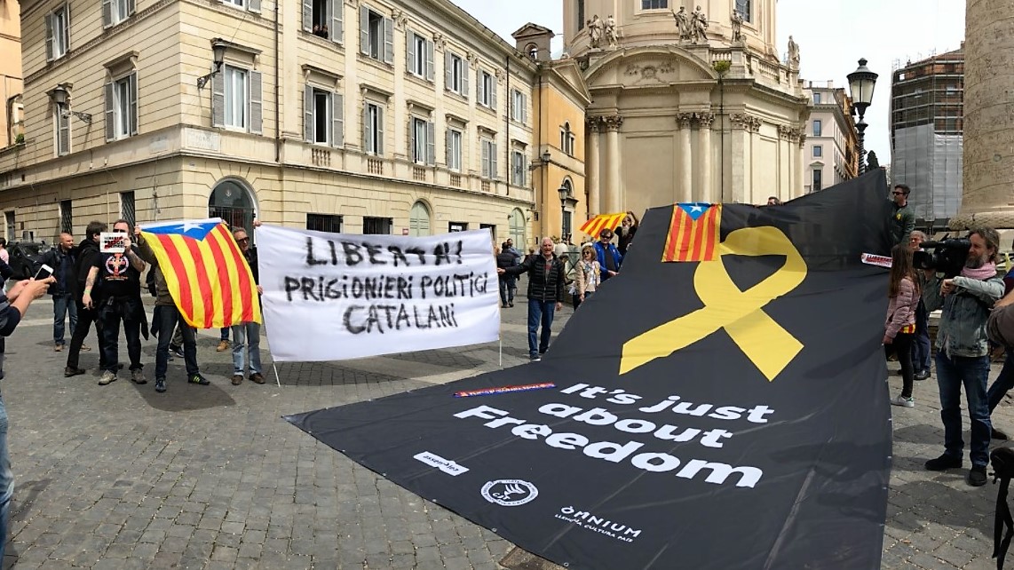 Unos 50 separatistas se han dado cita en la Piazza della Madonna di Loreto, junto a la Columna de Trajano, para reivindicar la libertad de los políticos catalanes encarcelados. Este grupo de seguidores ha proferido gritos de"libertad"y ha desplegado un dos pancartas gigantes ante las miradas curiosas de los transeúntes, algunos de los cuales eran turistas españoles que paseaban por la zona y que increparon a los independentistas al grito de "delincuentes".