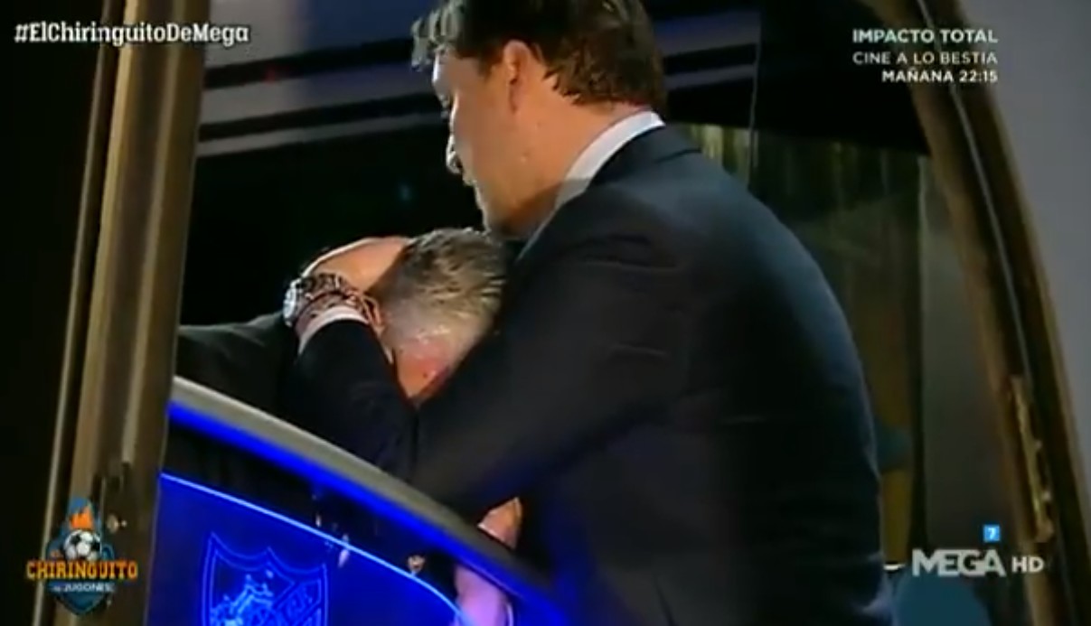 El Chiringuito de Mega mostró a Quico Catalán, presidente del Levante, consolando a Martín Aguilar directivo del Málaga, tras el descenso del club andaluz.