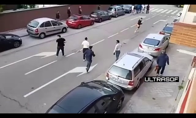 El vídeo muestra a varios ultras pateando en el suelo a un hincha del Barça que portaba una bandera española. Se desconoce si son radicales del Sevilla, rival copero del club azulgrana.