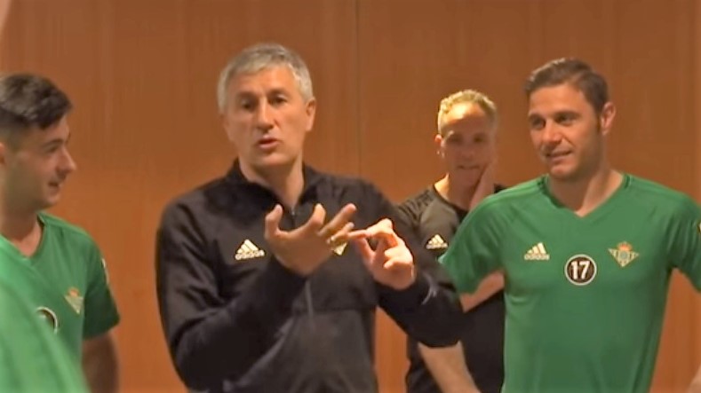 El entrenador Quique Setién propuso un juego con números en el que había que dar una palmada en los números que acaben en siete o fueses múltiplos del mismo número: "A ver si pasamos del 20"