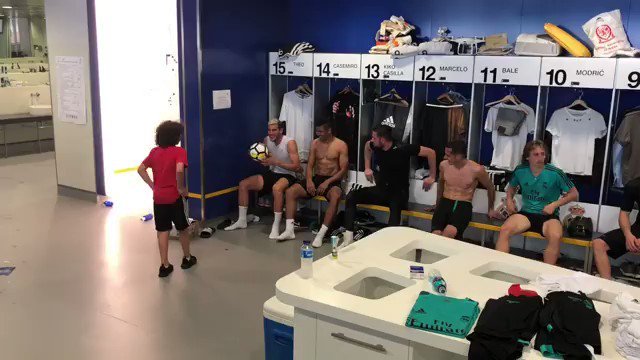 Enzo Alves Vieira, de sólo 8 años, demuestra sus dotes futbolísticas con varios jugadores del primer equipo madridista, entre ellos su propio padre, con este reto en el vestuario de Valdebebas.