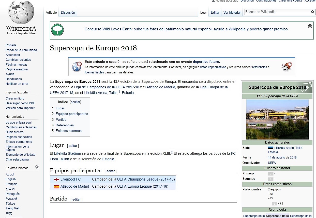 El caso es que, a la hora de consultar Wikipedia, en la descripción inicial sí se refleja que "el encuentro será disputado entre el vencedor de la Liga de Campeones de la UEFA 2017-18 y el Atlético de Madrid, ganador de la Liga Europa de la UEFA 2017-18, en el Lilleküla Arena" en Tallin (Estonia).