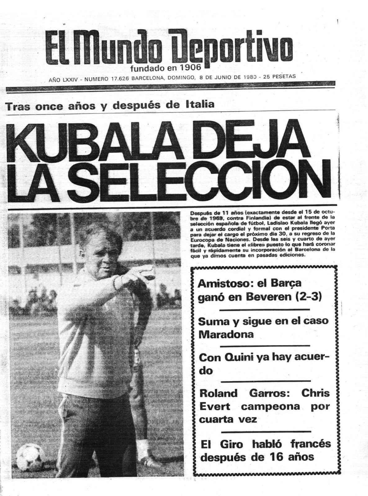 La mañana del 8 de junio de 1980, Mundo Deportivo sorprendía a propios y extraños con un titular inesperado en su portada: "Kubala deja la selección". El Barcelona había cerrado la contratación del seleccionador español que tras 11 años al cargo de la misma abandonaba la Federación para poner rumbo al Camp Nou.
