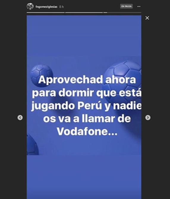 Lo que no es una sorpresa es que el pequeño Nicolás dé la nota. Los hechos sucedieron el sábado, durante la disputa del Perú-Dinamarca.Francisco Nicolás Gómez Iglesias decidió entonces realizar un Instagram Stories con estas palabras. "Aprovechad ahora para dormir que está jugando Perú y nadie os va a llamar de Vodafone...".