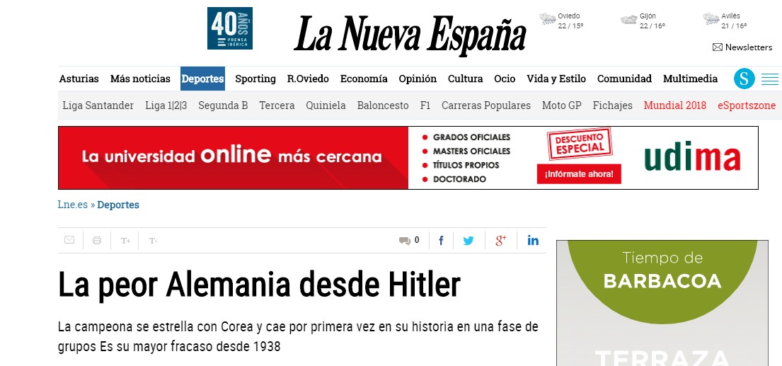 Salvo que alguien suba la apuesta y titule una noticia con algo más sorprendente, las redes sociales ya han calificado el titular de La Nueva España sobre la eliminación de Alemania como el más polémico y desafortunado del Mundial de Rusia 2018. "La peor Alemania desde Hitler", reza la publicación.
