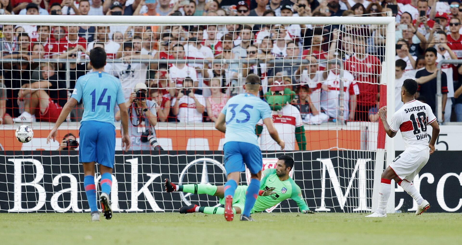 La segunda mitad, ya sin Lemar, Gelson, Saúl, Kove ni Juanfran, contó prácticamente de salida con un notable disparo de Correa bien resuelto por el meta local, pero sobretodo con la sorpresa de ver al Stuttgart adelantándose en el marcador. Lo hizo por medio de una pena máxima cometida por el joven Montero sobre Didavi. El propio Didavi engañó a Adán para hacer el primero de la tarde.