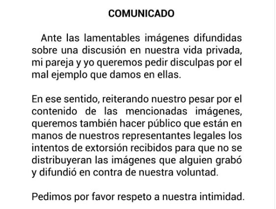 En dicho comunicado pide perdón por lo sucedido, la mala imagen que genera y por ser un mal ejemplo. Acaba el comunicado pidiendo respeto por su vida privada.