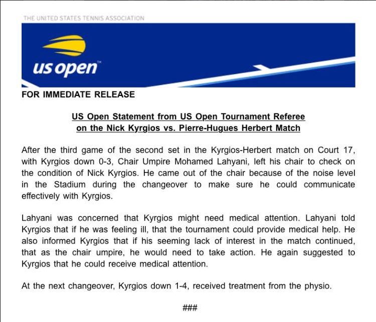 La noticia ha tenido tanto revuelo que la organización del Us Open emitió un comunicado acerca del comportamiento del arbitro sueco. Aseguran que Lahyani, el árbitro, bajó de la silla "para comprobar como estaba Kyrgios" y que baja "porque el ruido le impedía comunicarse con él". Añaden en el comunicado que "le ofreció atención médica por si se encontraba mal. Lahyani le dijo a Kyrgios que si se sentía enfermo, el torneo le podía dar asistencia médica. Además le informó de que tendría que actuar si seguía mostrando poco interés en el partido y le insistió en que buscara asistencia médica".