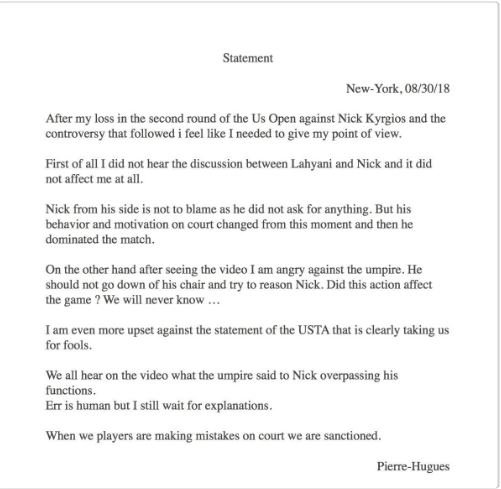 La historia no termina aquí. Hay un tercer capítulo con otro comunicado. El que firma Pierre-Hughes Herbert. El tenista dice que "no escuchó la conversación entre Lahyani y Nick (Kyrgios) y que no le afectó" pero añade que "la energía y la motivación de Kyrgios cambió desde ese momento hasta dominar el partido". El tenista francés afirma estar "enfadado y mucho más porque la USTA (Asociación de tenistas de Estados Unidos) nos toma por tontos". Para terminar, concluye que "todos hemos oído en el vídeo y se ve que se pasa de sus funciones. Es un error humano y sigo esperando explicaciones. Cuando los jugadores cometemos errores somos sancionados".