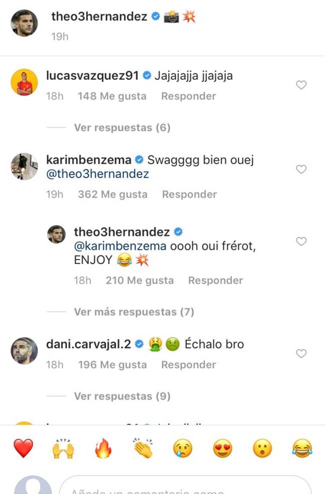Lucas Vázquez no pudo evitar reírse con la publicación de Theo, comentando la foto hasta cinco veces con carcajadas.