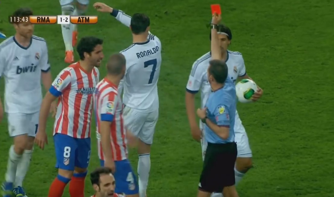 Miguel Ángel Ayza Gámez, colegiado de aquel encuentro, le mostraba la roja directa a Cristiano. En una trifulca al borde del área Cristiano, siempre según el acta, golpeaba a Gurpegui en la cara estando el juego detenido. Lo peor vino después: sus airados gestos tras ver la tarjeta, aumentaron su sanción a tres encuentros de Liga. Fue en 2013.