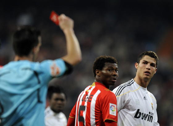 Primera temporada en el Bernabéu y Cristiano vivió su primera expulsión. Fue ante el Almería. La primera amarilla la vio por celebrar un gol quitándose la camiseta y la segunda por una patada por detrás a Juanma Ortiz con el partido casi terminado.