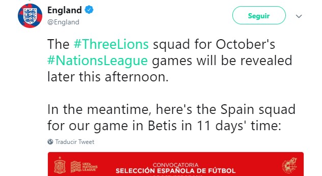 "La convocatoria de los tres leones para los partidos de la Liga de Naciones en octubre, se irán revelando a lo largo de la tarde. Mientras tanto, aquí está la lista de España para el partido en Betis en 11 días", señalaban en el tuit.