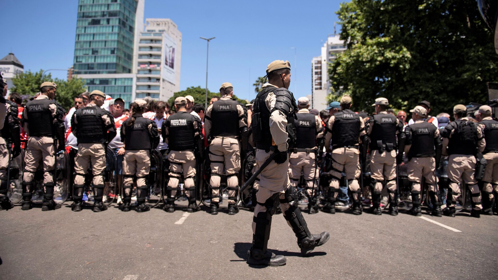 Efectivos policiales registraron este lunes el estadio Monumental tras los hechos de violencia protagonizados por hinchas del River Plate el sábado antes del partido de vuelta de la final de la Copa Libertadores contra el Boca Juniors, que finalmente se pospuso sin fecha definida.