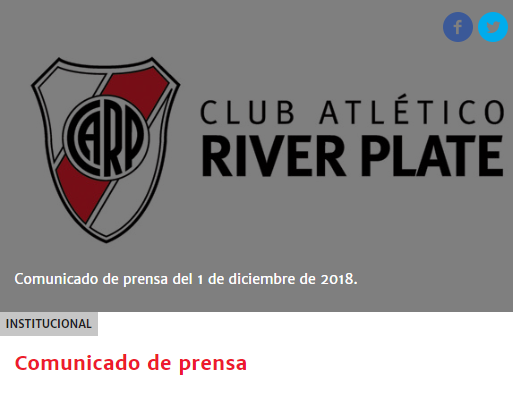 - La responsabilidad por la falla del operativo de seguridad del día sábado 24 del corriente mes, ocurrida fuera del anillo perimetral dispuesto para el evento, fue, además de pública y notoria, asumida abiertamente por las más altas autoridades del Estado. Esto equivale a decir que los hechos que River Plate lamenta -y por los que se solidarizó oportunamente- no son de ningún modo responsabilidad del club.