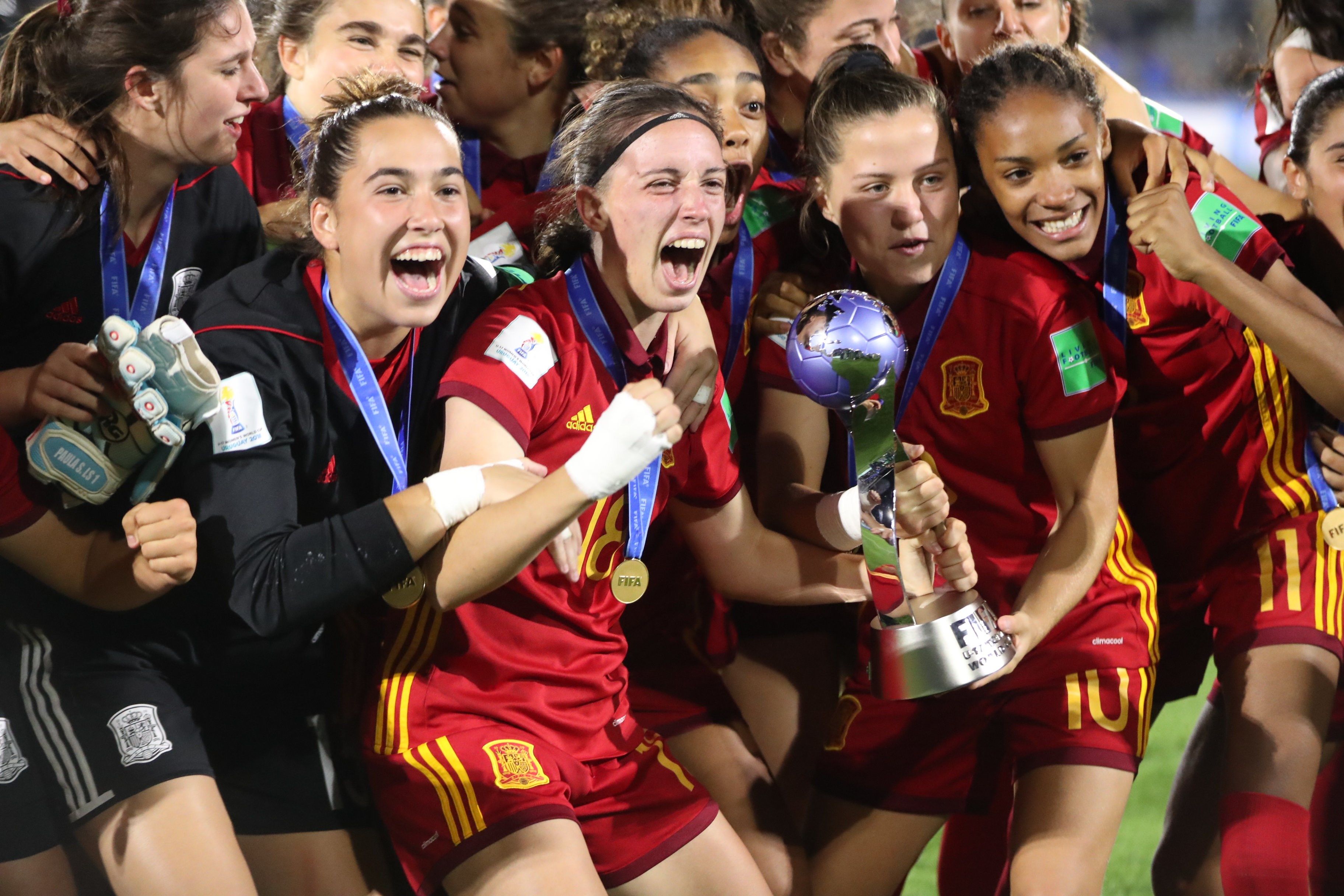 La selección española levantó por primera vez este sábado la copa del Mundial femenino Sub'17 tras ganar 2-1 a México, con un doblete de Claudia Pina, en el estadio Charrúa de Montevideo.