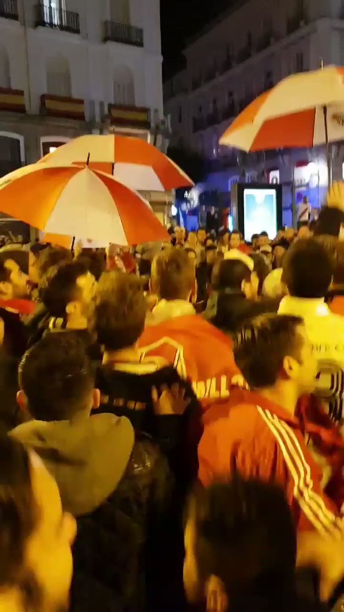 Alegría desbordada en la Puerta del Sol de Madrid de los hinchas de Rivar tras ganar la Copa Libertadores.