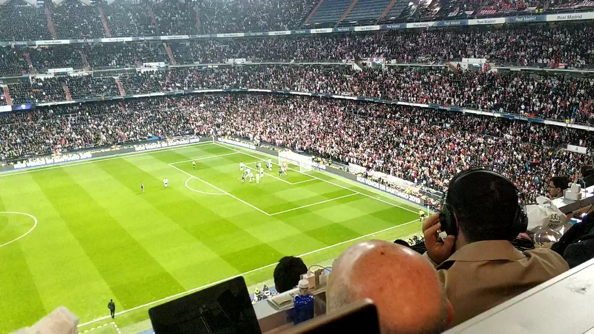 Los periodistas argentinos, hinchas de River, celebran por todo lo alto el gol del Pity Martínez que suponía la sentencia.