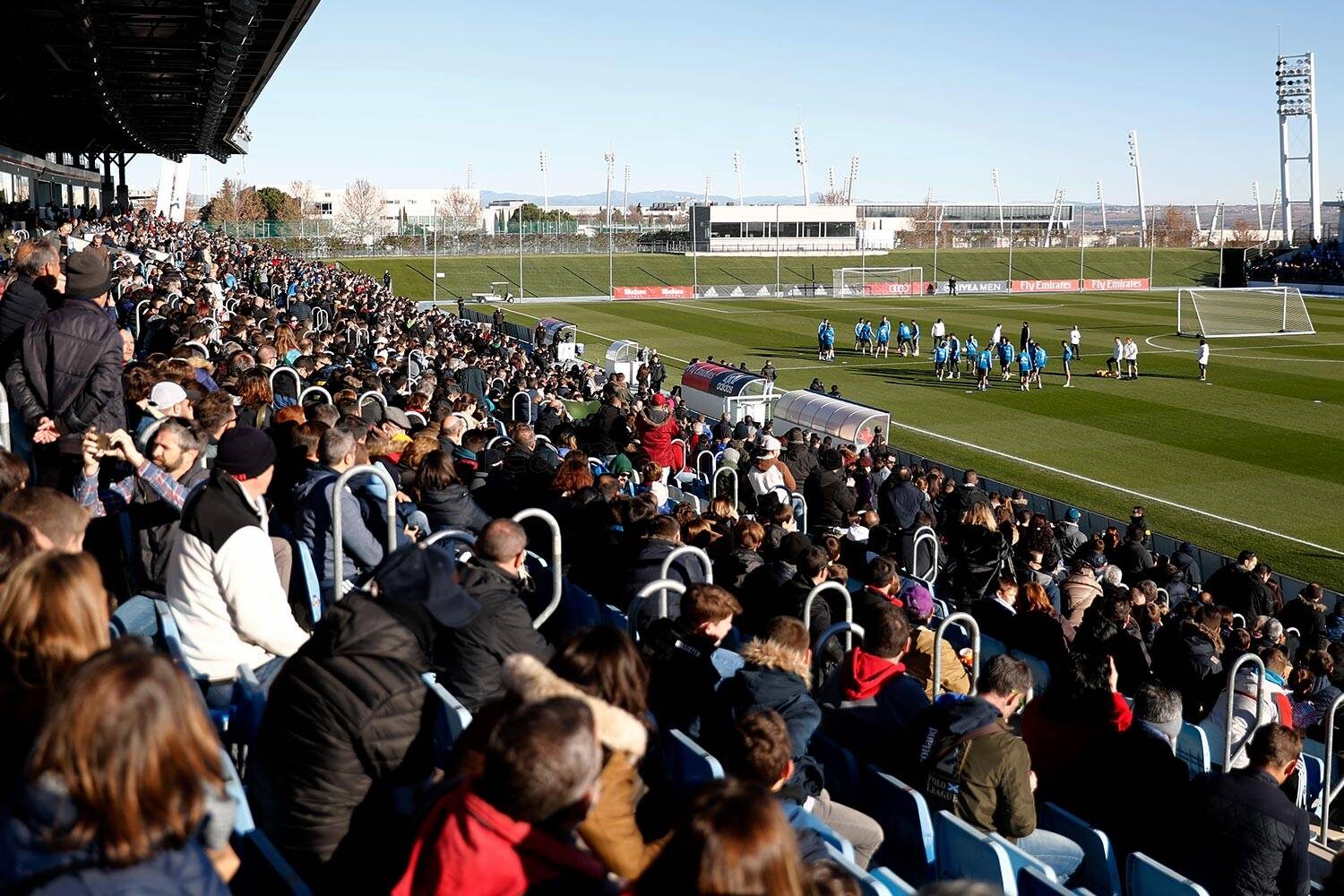 Ha sido una mañana distinta en Valdebebas. El estadio Alfredo Di Stefano ha abierto sus puertas para acoger, como es tradición, a sus aficionados en el entrenamiento navideño con público. Unos 8000 socios, mucho de ellos niños, llenaron las gradas.