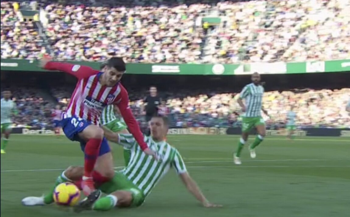 Transcurría el minuto 55 con empate en el marcador. Álvaro Morata entró al área del Betis con el balón controlado, la posición tomada y dispuesto a disparar. Feddal, defensa del Betis, está en situación límite, y se tira al suelo para evitar el disparo. No toca la pelota y derriba a Morata. La acción es clara, pero el colegiado, Medié Jiménez, no señaló penalti. Pese a la claridad del penalti, el VAR tampoco entró a valorar la jugada. No se perdió ni treinta segundos en juzgar una acción que era clave en el encuentro.