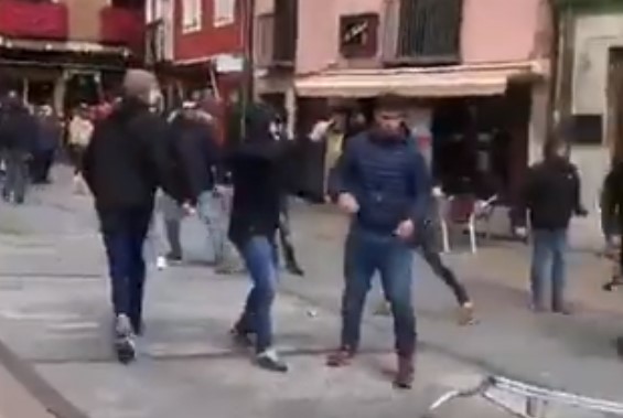 Y es que la Plaza de San Martín se convirtió este domingo por la mañana en un improvisado campo de batalla entre los grupos más radicales de ambas aficiones. En apenas minutos, empezaron a volar las sillas que unos hinchas se lanzaban a otros, aunque afortunadamente no hay que lamentar heridos.