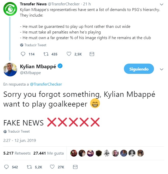 El delantero francés tiró de ironía y aseguró que se habían olvidado de otra exigencia: Kylian Mabppé quería jugar de portero. Posteriormente aseguró que la información era falsa.
