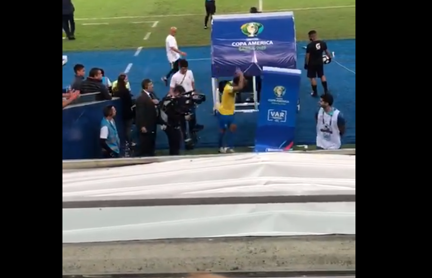 El jugador brasileño pagó su enfado tras ser expulsado en la final de la Copa América y golpeó la televisión del VAR. Un operario evitó que se cayera al suelo.