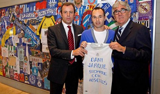 Iniesta con la recordada camiseta, junto a Sandro Rosell y Daniel Sánchez Llibre, expresidentes de Barcelona y Espanyol, respectivamente.