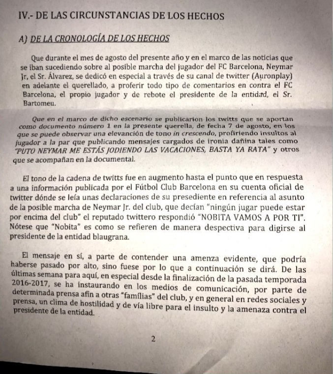 La historia de esta denuncia comienza en 2017 cuando Neymar deja el Barcelona para irse al PSG. Una decisión inesperada y que dolió a muchos azulgranas. Entre ellos, el youtubuer AuronPlay que tiene casi 18 millones de suscriptores. Cuando se marchó al PSG, Raúl Álvarez, que es el nombre del youtuber, expresó su frustración y lo pagó con todos los protagonistas del traspaso. "Neymar, cabrón". "Neymar, me has jodido la vida". "Nobita, vamos a por ti", "Bartomeu, dimisión", fueron algunas de sus expresiones. Raúl ha explicado, a través de su canal de Youtube, que todo eran bromas. "Yo soy del Barça, pero que un jugador se vaya no me quita el sueño. Durante un tiempo estuve con este meme de Nobita. Puse tonterías absurdas y, cuando pasó el tiempo, dejé de hacer bromas", afirmó.