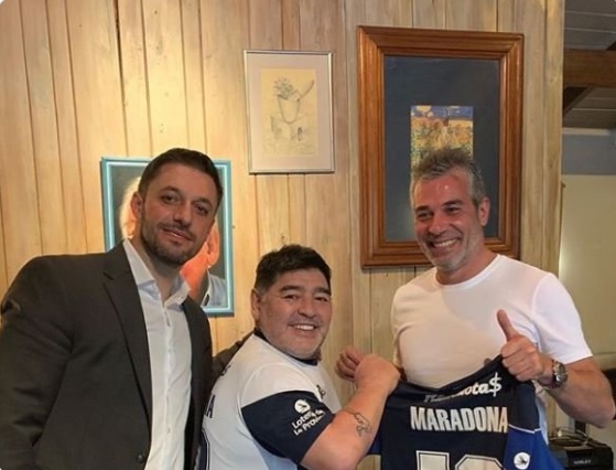 ¡Bienvenido Diego a la #Superliga! #Maradona ya es director técnico de @gimnasiaoficial y lució la casaca del unto a su presidente, Gabriel Pellegrino#MaradonaAzulyBlanco #MaradonaEnGimnasia #Gimnasia