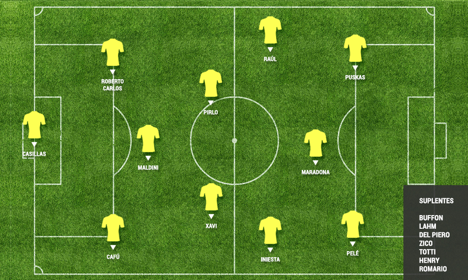 En un teórico banquillo de los suplentes podríamos encontrar otros grandes nombres como los de Oliver Kahn, Gianluigi Buffon, Philipp Lahm, Ryan Giggs, Del Piero, Totti, Zico, Romario o Thierry Henry.