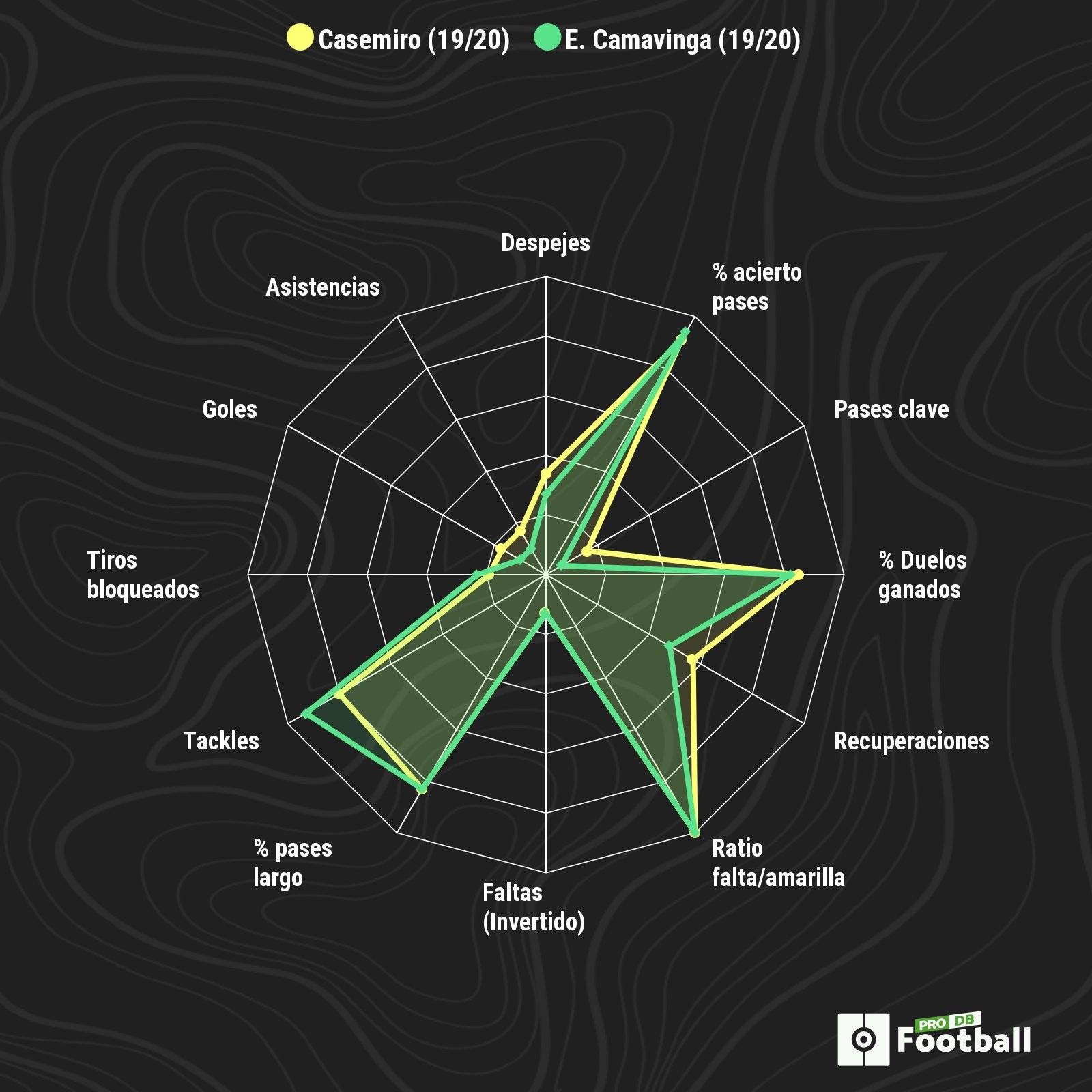 Lo primero que destaca de Camavinga es lo completo que es. Un auténtico pulpo en la marca, a la hora de recuperar recuerda mucho a Casemiro. Fíjense en el gráfico elaborado por @ProFootballDB en el que los datos de esta temporada del brasileño y el franco angoleño parecen una calcomanía.