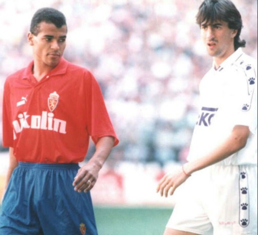 Uno de los mejores laterales de la historia del fútbol, Cafú, jugó en el Zaragoza. En la imagen, junto a Emilio Amavisca. Fue en la temporada 1994/95 con Víctor Fernández como entrenador y disputando tres títulos, Liga, Copa y Recopa. Cafú no llegaba como un desconocido. Es cierto que todavía no era el jugador que luego deslumbraría a todos pero ficha por el Zaragoza después de ganar el Mundial de 1994 con Brasil. Cafú llegó a disputar la final ante Italia. Aquel año había sido nombrado como mejor jugador sudamericano. Este Zaragoza ganaría una Recopa pero Alberto Belsué tiene el honor de poder decir que era titular por delante del lateral que luego destacó en Milán y Roma.