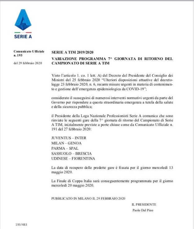 Los cinco partidos son Milán – Genova, Parma – SPAL, Sassuolo – Brescia, Udinese – Fiorentina y el gran encuentro de la jornada, Juventus ante Inter de Milán. En un principio se especuló con jugar esos encuentros a puerta cerrada pero finalmente se han decantado por el aplazamiento. Esta decisión afecta también a la Copa que estaba prevista disputarse el 13 de mayo. Ahora la final se retrasa una semana, al 20 de mayo.