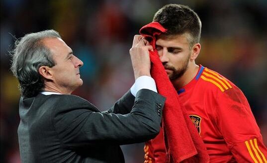 "En el primer partido me abrieron la ceja, en el segundo el labio, y en dos días, en un entrenamiento, me dieron un pelotazo en la boca y me abrieron de nuevo el labio. Recuerdo a Vicente del Bosque diciendo: 'Pero qué mala suerte que tiene este chico'. Pero sí: me rompí la cara por España. ¡Viva el Rey!", comentó Piqué en la entrevista.