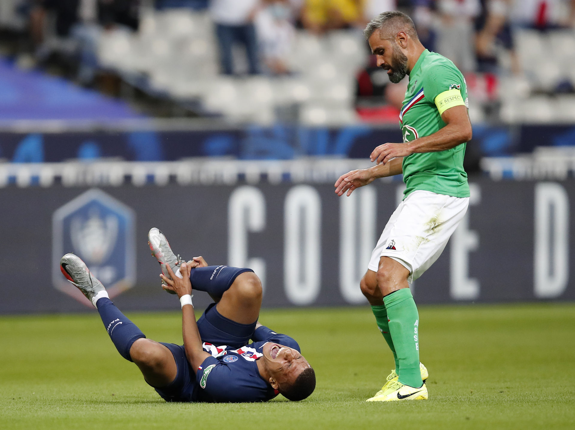 El infractor, capitán del St-Éttienne, casualmente jugaba el último partido de su carrera. El delantero salió del campo por su propio pie pero cojeando y con lágrimas en los ojos. Fue sustituido por el exsevillista Pablo Sarabia.