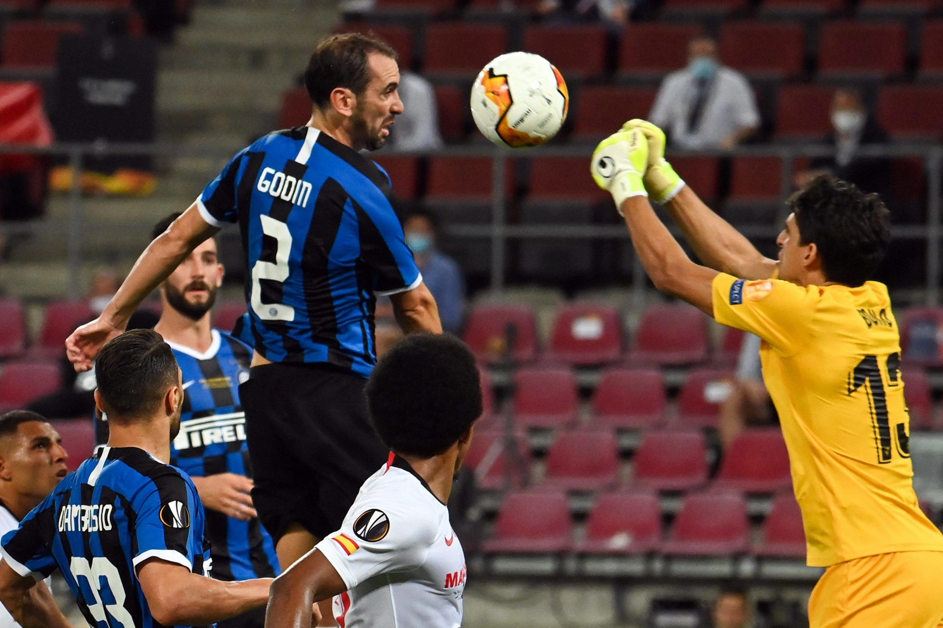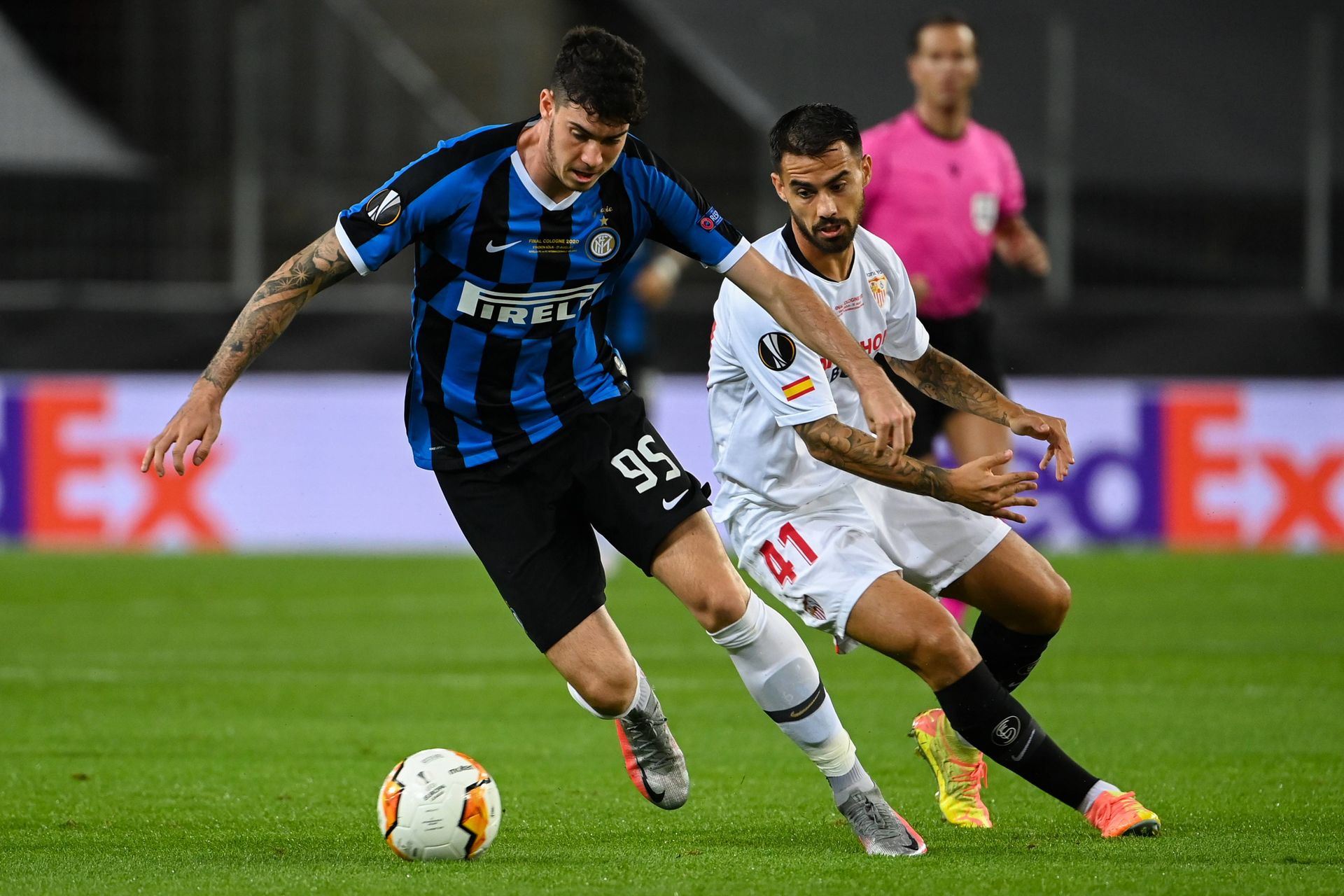 Alessandro Bastoni, del Inter, y Suso, del Sevilla, en plena lucha por el balón.