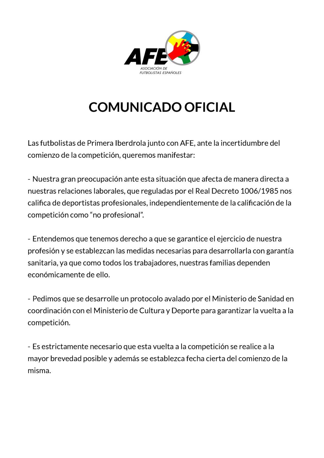 Después de la incertidumbre de no saber en qué fecha volverán a retomar la competición, las jugadoras de la Primera Iberdrola y la Asociación de Futbolistas Españoles (AFE) han solicitado este miércoles a las autoridades competentes volver a la actividad con "la mayor brevedad posible".