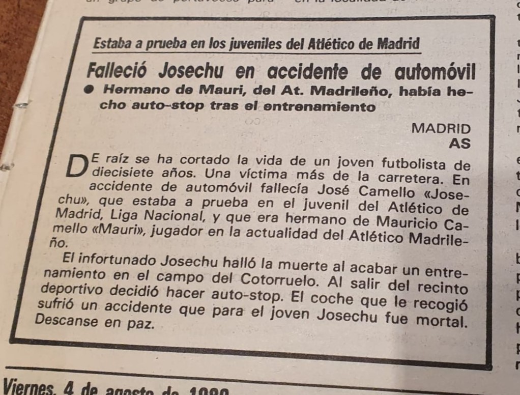 El fallecimiento de Josechu con solo 17 años tras un accidente de coche es sin duda el golpe más duro que han sufrido los Camello. El cuarto hermano de los cinco que eran en la familia también fue futbolista y, como no, canterano del Atlético de Madrid. Fue justo después de firmar con el juvenil cuando un 2 de agosto, nada más terminar el entrenamiento, Josechu perdía la vida en un accidente de tráfico.