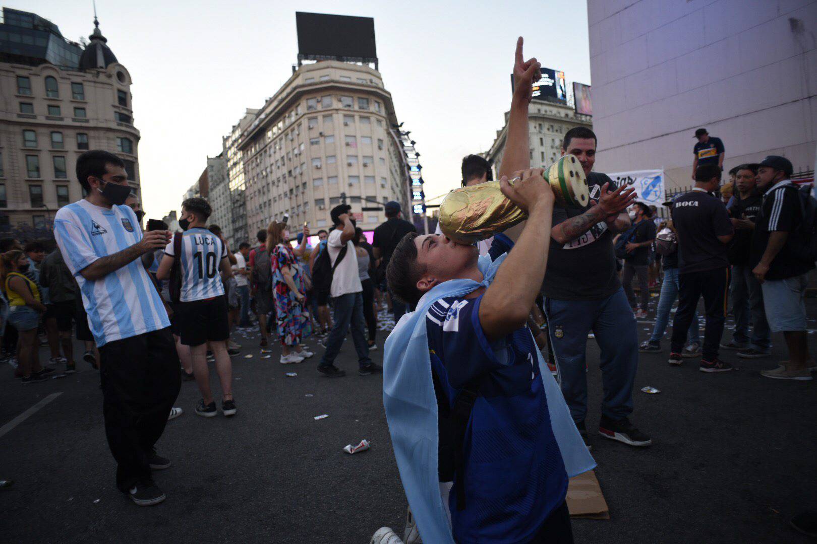 Varios aficionados con la camiseta de la selección argentina y portando una réplica de la Copa del Mundo de fútbol, salieron a las calles de Buenos Aires para despedir al astro del fútbol.