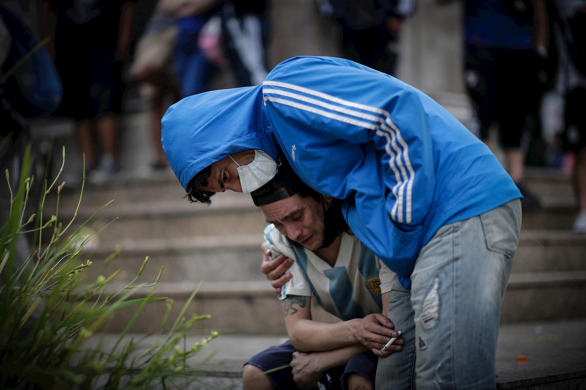 Dos seguidores de Maradona lloran la muerte de su ídolo en las calles de Buenos Aires.