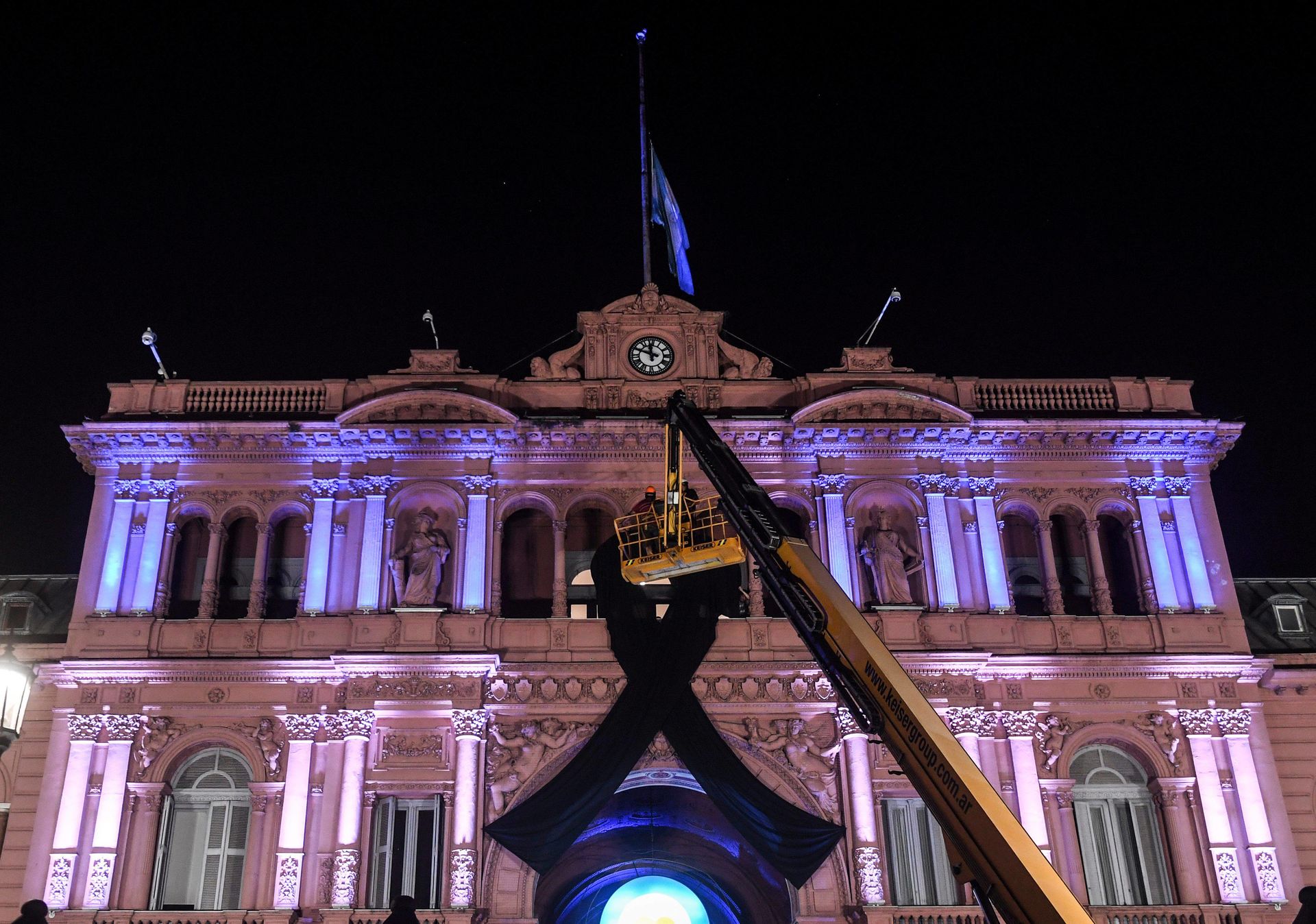 En la fachada de la Casa Rosada, el palacio del presidente en la Plaza de Mayo, se ha colocado una cinta negra de luto. Argentina llora al ícono del fútbol Diego Maradona.
