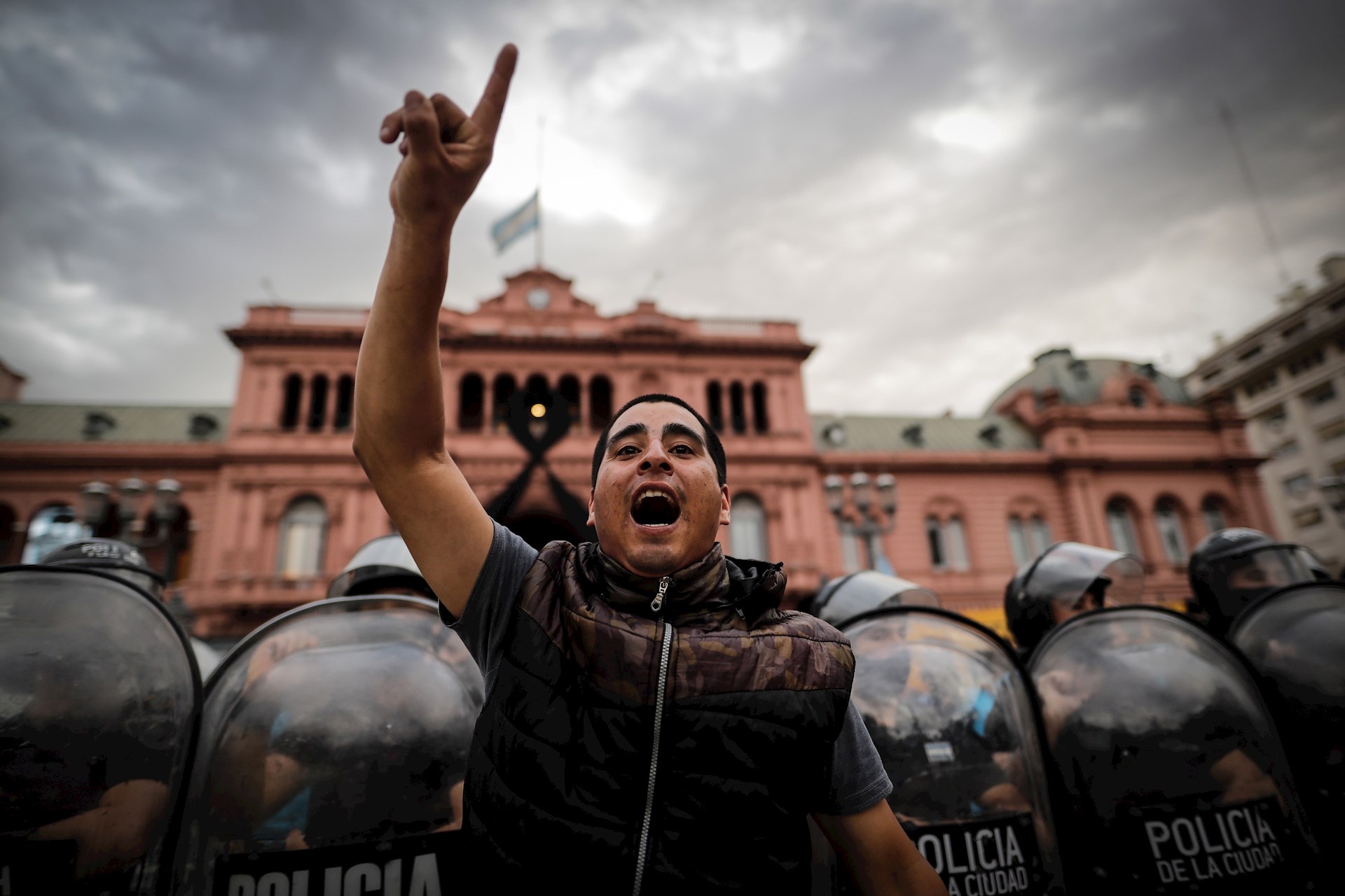 Un seguidor de Diego Armando Maradona ante un grupo de efectivos de la Policía a las puertas de la Casa Rosada donde este jueves se ha abierto la capilla ardiente del astro argentino que falleció ayer a los 60 años en su residencia de Tigre a consecuencia de un paro cardíaco