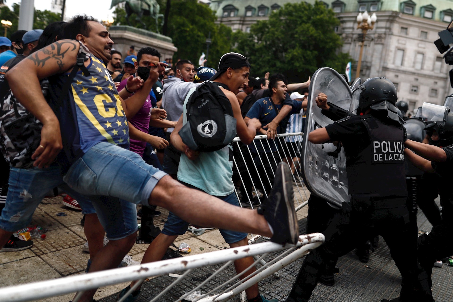 Varias personas se enfrentan a efectivos de la Policía a las puertas de la Casa Rosada donde este jueves se ha abierto la capilla ardiente de Diego Armando Maradona.