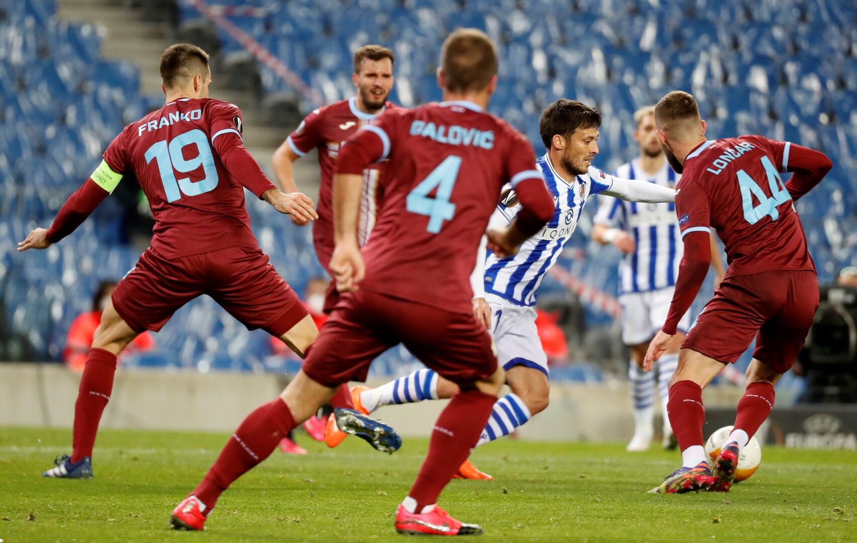 Los donostiarra, al igual que el Atlético -que disfruta en Liga y sufre en Europa-, siempre fue por debajo en el marcador y se vio obligado a jugar con prisas. El 0-1 fue obra de Velkoski, que remató una prolongación con la cabeza a escasos centímetros de la línea de gol. El tanto fue imparable y la ventaja no sería enjugada hasta el tramo final del partido.