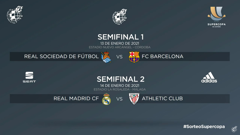 Real Sociedad-Barcelona y Real Madrid-Athletic Club serán las semifinales de la Supercopa los próximos 13 y 14 de enero, respectivamente, según el sorteo realizado por la Federación Española de Fútbol (RFEF) durante la Asamblea general Extraordinaria celebrada este jueves.